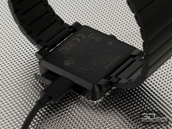 У Sony в этом плане все проще: поддерживаются любые смартфоны, работающие под управлением Android 4.0 и старше, метка NFC встроена прямо в корпус часов, разъем micro-USB также интегрирован в само устройство — на фотографиях его плохо видно, потому что он закрыт заглушкой. Заглушка не только для эстетики, но и пользы для: умные часы, как и флагманские смартфоны Sony, получили серьезную защиту от воды. В спецификациях указана категория IP57 — это означает, что часы можно кратковременно погружать в воду на глубину до метра, Galaxy Gear так не умеют.