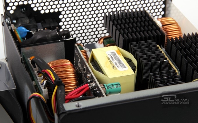 С точки зрения схемотехники исполнение модели Corsair RM750 можно назвать классическим для современных БП с высоким КПД уровня 80PLUS Gold и Platinum: однотактное первичное преобразование, крупный конденсатор номиналом 470 мкФ на 420 В, отдельные модули преобразования DC-DC во вторичных цепях, отдельная же плата защиты. Монтаж плотный, но к исполнению не придерёшься. Производитель дополнительно акцентирует внимание на использовании высококачественных конденсаторов, а также добротно выполненных намоточных элементов для обеспечения низкого уровня шума.