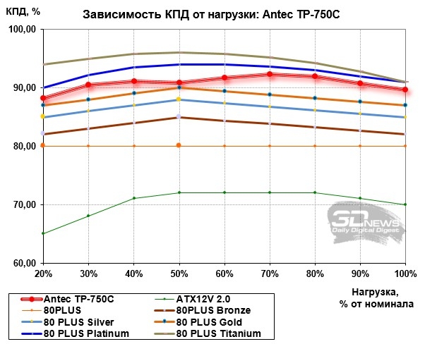 Со времени наших последних статей о блоках питания методика тестирования, применяемая в лаборатории 3DNews, изменений не претерпела. Ознакомиться с ней в полном объёме можно, например, в этой статье. График, составляемый по результатам исследования коэффициента полезного действия тестируемых блоков питания, содержит эталонные показатели по стандартам семейства 80PLUS, а также минимальные требования базового стандарта ATX12V версии 2.2.