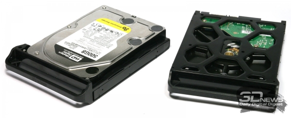 Помимо чисто внешних изменений по сравнению со своими предшественниками, модель Synology DS414 получила ещё и обновлённую конструкцию дисковых салазок. Они полностью выполнены из упругого пластика и вместо лицевой панели с замком имеют большую ручку, за которую их легко и быстро можно монтировать или демонтировать в дисковом отсеке NAS. Но самое главное, что для крепления дисков в салазках теперь не требуется применение отвёртки. Салазки с боков имеют съёмные пластины со штифтами, которые вставляются в соответствующие отверстия на боковых гранях дисков. Чтобы пластины самопроизвольно не выпадали, в отверстия на салазках вставлены мягкие резиновые втулки, в которые штифты входят с небольшим натягом. Вся операция по установке каждого диска занимает не более пяти секунд. При этом сохранилась и возможность монтажа 2,5-дюймовых носителей, но для их установки придётся использовать обычные винты, отверстия для которых в салазках также предусмотрены.