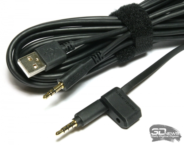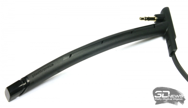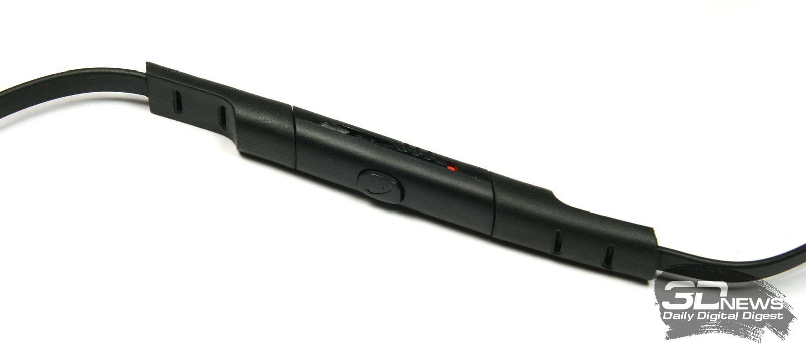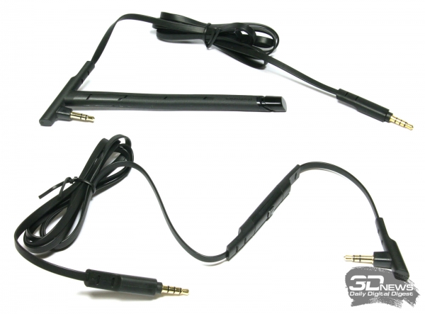 У второго микрофона систем шумоподавления не заявлено, но зато его можно использовать при эксплуатации гарнитуры в дороге, когда она подключена к смартфону. Этот микрофон выполнен в виде небольшого пластикового утолщения на проводе и имеет обычные для такого типа устройств кнопку приёма звонка и сдвижной ползунок включения или отключения микрофона. Стоит отметить, что все аудиокабели из комплекта поставки выполнены в виде «лапши». Их прорезиненная оплётка очень мягкая и не дубеет на морозе.