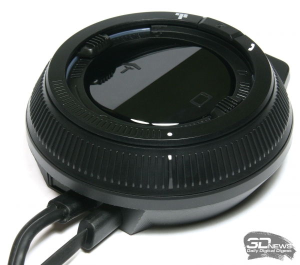 Аудиокабели от микрофонов могут быть подключены к источникам звука напрямую, но основной вариант работы предполагает подключение гарнитуры через микшер. Как уже было сказано выше, микшер в данном случае — это главная изюминка всей системы, отличающая Plantronics RIG от других гарнитур. Выполнен он в виде... Хм... Пожалуй, в виде шайбы, ибо описать его геометрические формы как-либо по-другому довольно сложно. Цилиндр диаметром около 90 мм и высотой всего 38 мм имеет ребристое конусообразное кольцо снаружи для регулировки общей громкости звучания. Кольцо очень крупное и удобное для работы вслепую. По совместительству кольцо регулировки громкости предназначено ещё и для управления питанием микшера. Если его поворачивать до совмещения двух белых точек и далее, то после характерного щелчка микшер отключится. Включается он, соответственно, поворотом кольца в другую сторону.