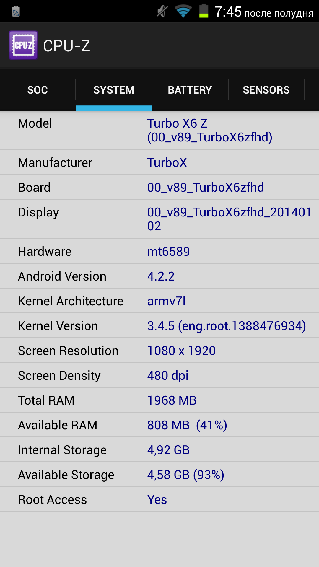 Процессор MediaTek MT6589T: четыре ядра ARM Cortex-A7 (ARMv7), частота 1,5 ГГц, техпроцесс 28 нм