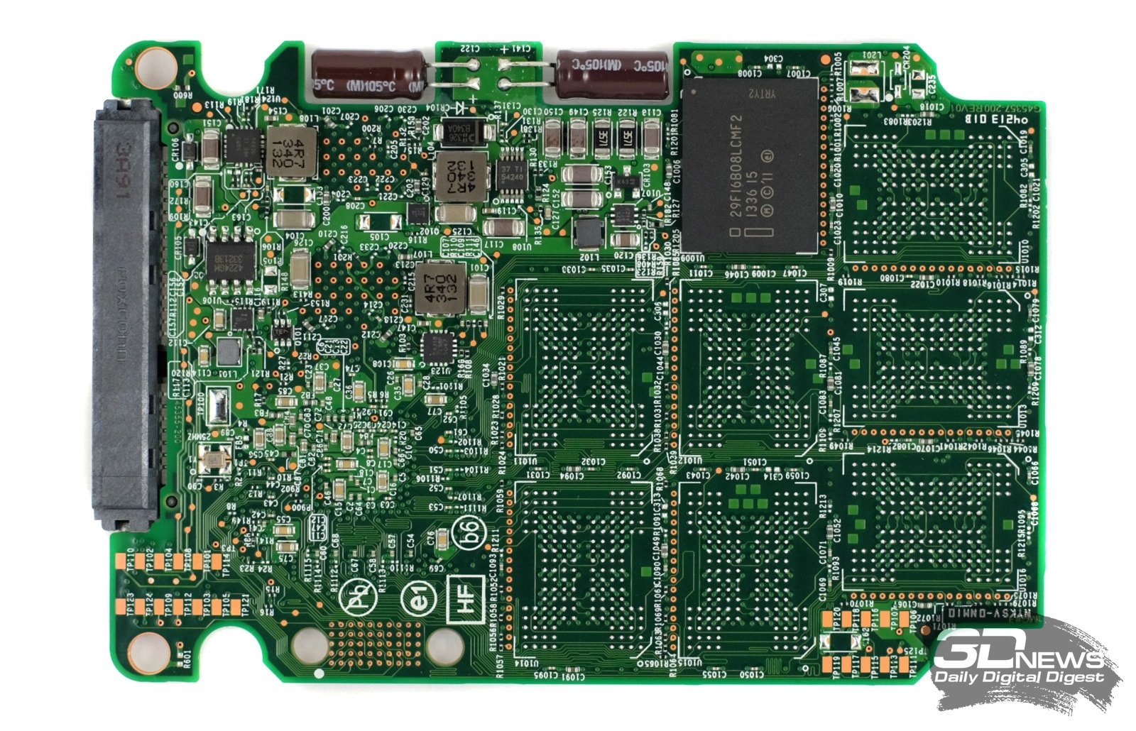 Впрочем, на наш взгляд, череп слабо оживляет внешний вид. Поэтому, не найдя красоты внешней, поищем красоту внутреннюю. И вот тут-то всё становится действительно очень интересно. Платы, применяемые в основе Intel 730, самобытны по конструкции и сильно похожи на начинку полноценных серверных SSD.