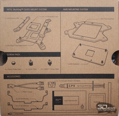 Удачно, на наш взгляд, оформлены и аксессуары. Для них припасена отдельная плоская коробка с изображением самих комплектующих на лицевой стороне крышки. Если отодвинуть её в сторону, взору оверклокера открываются те самые аксессуары, расположенные в отсеках, которые изображены на крышке.