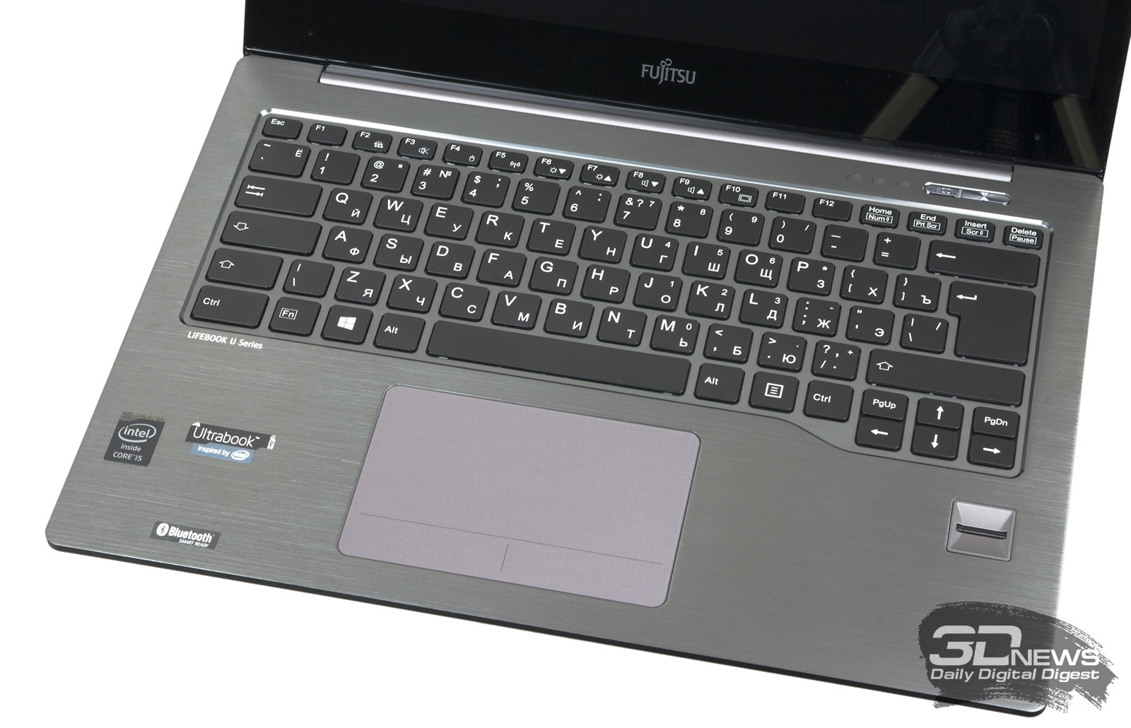 Клавиатура у 14-дюймового Fujitsu Lifebook U904 полноразмерная, не пострадали даже клавиши-стрелки, а многострадальная «ё», которую обычно ужимают до размеров молекулы, в данном случае, наоборот, растянулась на целых 19,5 мм в ширину. Промахнуться по ней будет сложно. Пользователям ультрабуков с клавиатурами американской системы (а это большинство поставляемых в нашу страну моделей) будет непривычен короткий левый «shift», рядом с которым припаркован «обратный слеш», да и с громадной Г-образной клавишей «Enter» не все смогут смириться.