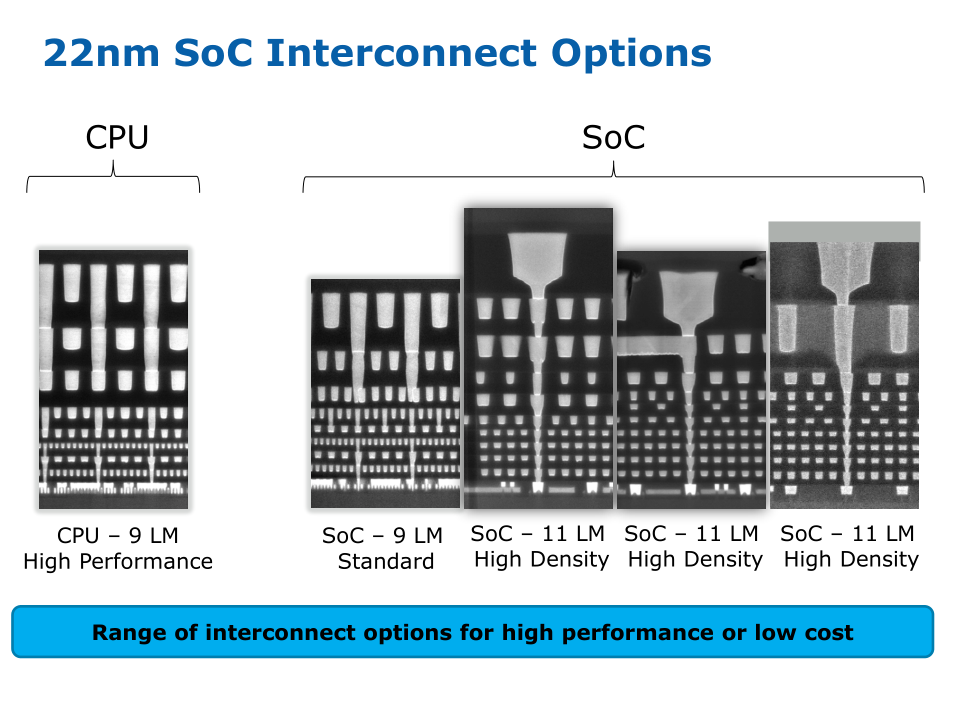 Кроме того, процесс P1271 гораздо более гибок. Он позволяет использовать различное количество металлических слоёв межсоединений для оптимизации стоимости, а также допускает добавление на кристалл отдельных участков с транзисторами с увеличенной толщиной оксида и более высокими сигнальными напряжениями для реализации схем ввода-вывода и внешних интерфейсов.
