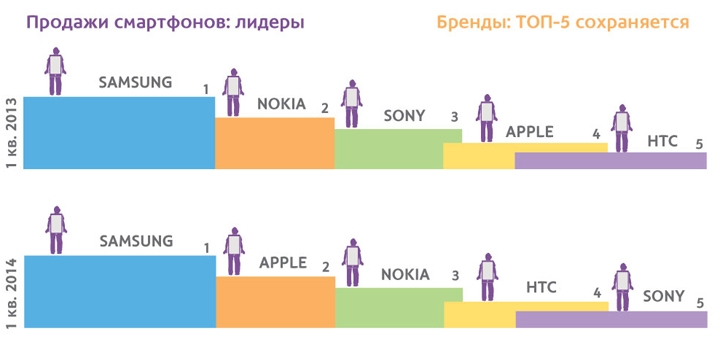 Самыми популярными марками смартфонов в России по-прежнему являются Samsung, Apple, Nokia, HTC и Sony, которые совокупно заняли более половины рынка смартфонов в штуках и свыше 70% в деньгах. В то же время значительно возросла роль В-брендов, особенно в сегменте смартфонов стоимостью до 5 тыс. рублей. По итогам трёх месяцев 2014 года этот сегмент занял уже 42% рынка в натуральном выражении, что на 20% больше, чем в аналогичном периоде прошлого года. Доля устройств В-брендов в данной ценовой категории составляет около 60% и в штуках, и в денежном выражении.