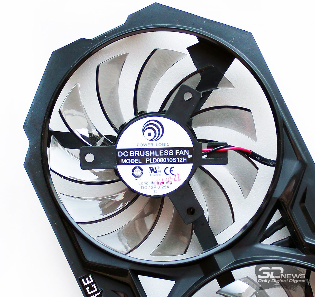 Охлаждается вся конструкция двумя вентиляторами компании Power Logic (модель PLD08010S12H) с одиннадцатью полупрозрачными лопастями.