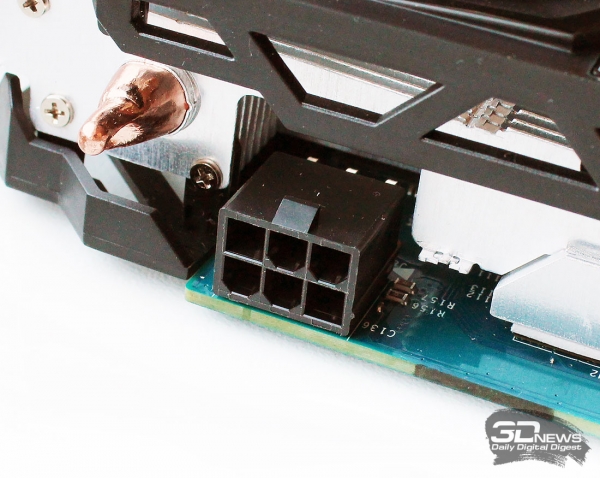 Как уже было отмечено выше, GeForce GTX 750 Ti обходится 60-ваттным питанием по шине PCI-Express, поэтому эталонные варианты этой видеокарты не оснащены разъёмом для дополнительного питания. Другое дело — Gigabyte GeForce GTX 750 Ti, при разработке которой инженеры не стали экономить на питании и установили на видеокарту один шестиконтактный разъём.