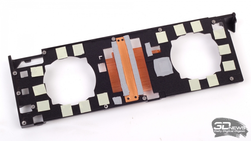 Поскольку в R9 295X2 используется не такой крупный плоский водоблок, как в оверклокерских видеокартах, предусматривающих подключение к открытой СВО пользователя, а два изолированных водоблока для GPU, остальные компоненты на плате охлаждаются воздухом. Большая часть лицевой стороны PCB покрыта алюминиевой пластиной с мелкими воздушными каналами, а транзисторы системы питания оснащены отдельным медным радиатором. Для обдува этих радиаторов и предназначен центральный вентилятор, смонтированный на кожухе устройства.