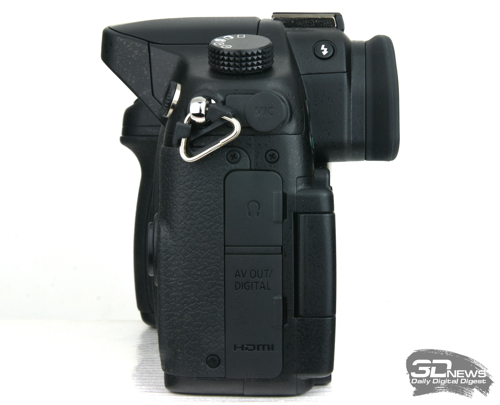 Левый борт загружен сильнее. Тут, под тремя резиновым заглушками, скрыты разъёмы подключения внешнего микрофона, наушников, а также HDMI- и USB/AV-кабелей. На боковой поверхности видоискателя установлена клавиша управления вспышкой. Место весьма неожиданное, да и использовать данную клавишу не особо удобно.