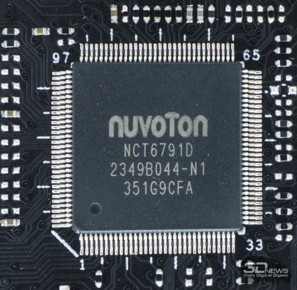 Микросхема NCT6791D от Nuvoton расположилась под радиатором чипсета — она точно такая же, как и на многих других материнских платах ASUS. В активе ее технологий — возможность управлять скоростью вращения кулеров как с помощью ШИМ, так и за счет изменения напряжения. Она же осуществляет мониторинг с двух набортных термодатчиков (CPU и MB) и одного дополнительного, который можно присоединить к разъему T_SENSOR1 в нижней части платы. После более чем десятка контролируемых температур на любой из последних плат серии SABERTOOTH это очень грустно. Еще более грустно становится, когда вспоминаешь, что копеечной по стоимости термопары в комплекте нет.