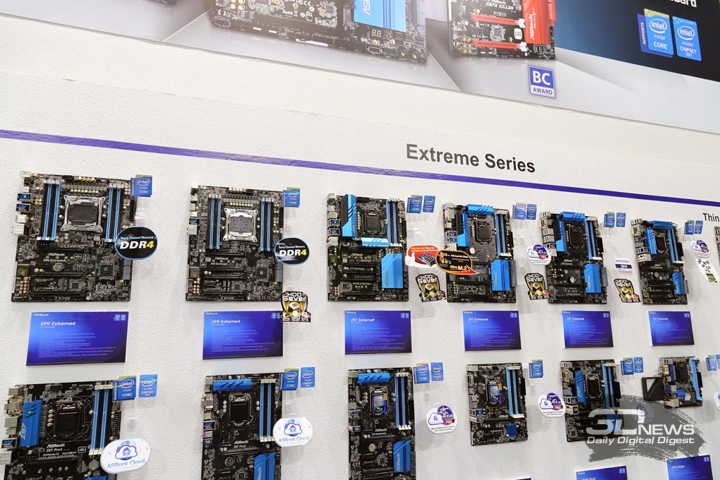 Экспозиция ASRock посвящена прежде всего материнским платам. В павильоне компании, в частности, представлены матплаты Extreme Series для самых требовательных пользователей и любителей разгона, а также модели Gaming Series для игровых систем.