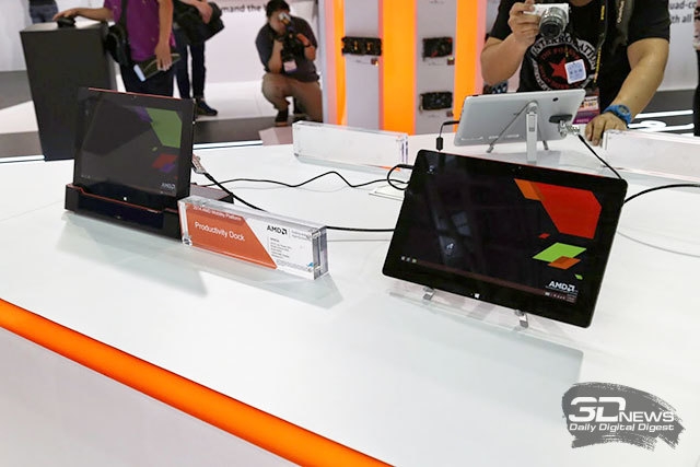 Не считать же продемонстрированный уже не раз на выставках прототип самой AMD, оснащённый 4-ядерным чипом Mullins, 2 Гбайт оперативной памяти, 60-Гбайт SSD и экраном с разрешением 1920×1080. Это устройство дополняется отличной многофункциональной док-станцией, но на рынке таких платформ пока не видно.