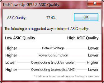 Если у эталонных версий AMD Radeon R9 270X базовая частота графического процессора в 3D-режиме составляет 1000 МГц и может увеличиваться до 1050 МГц, то на MSI Radeon R9 270X Gaming она равна 1030 МГц и может возрастать вплоть до 1120 МГц. Это не рекордный разгон для заводских R9 270X, но всё же на 6,7% выше номинала. В 2D-режиме частота снижается до 300 МГц. Значение ASIC Quality попавшего к нам кристалла равно 77,4%.