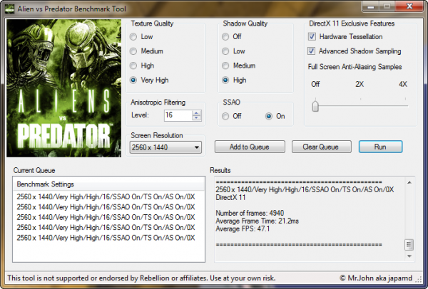 Для проверки температурного режима работы видеокарты MSI Radeon R9 270X Gaming в качестве нагрузки мы использовали пять циклов теста весьма ресурсоёмкой игры Aliens vs. Predator (2010) при максимальном качестве графики в разрешении 2560х1440 пикселей с анизотропной фильтрацией уровня 16х, но без MSAA-сглаживания. В этом режиме тестирования видеокарта прогревалась сильнее, чем при включении MSAA.