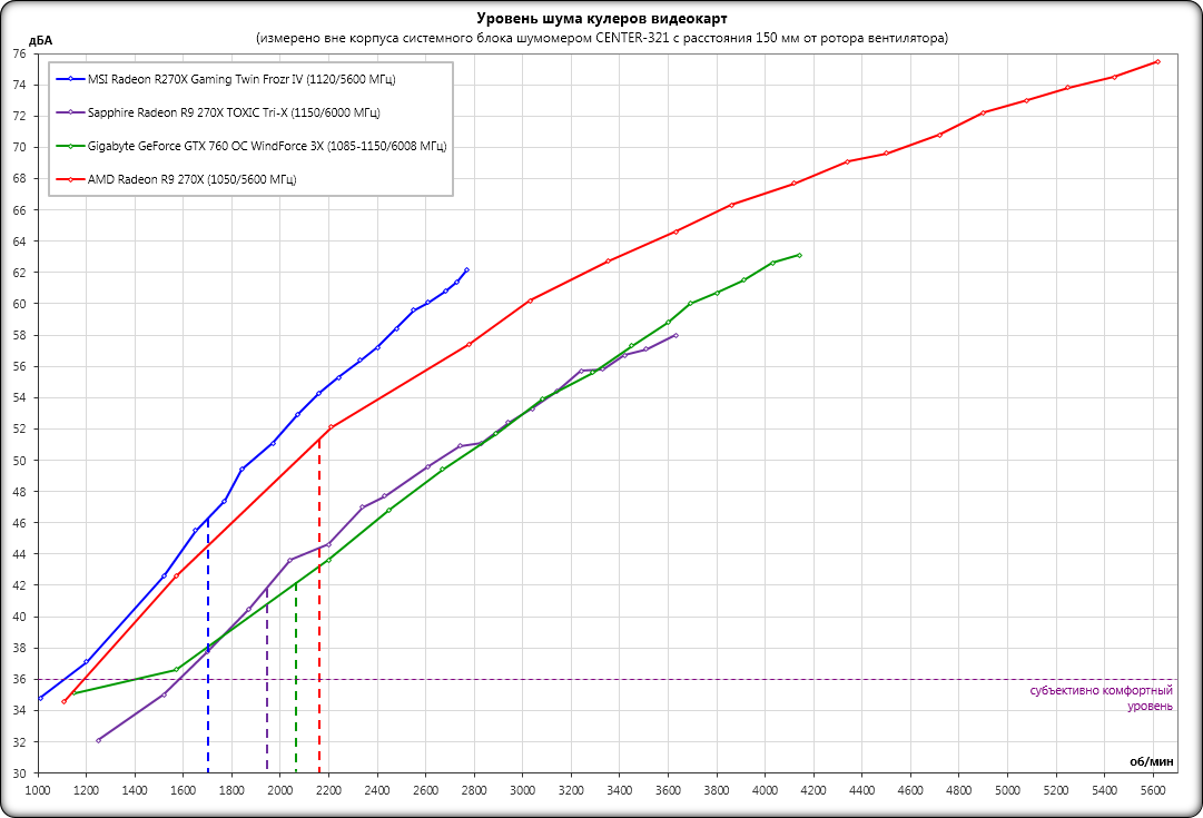 Для сравнения уровня шума системы охлаждения MSI Radeon R9 270X Gaming в диаграмму мы включили результаты измерений уровня шума эталонной AMD Radeon R9 270X, а также оригинальных Sapphire Radeon R9 270X TOXIC Tri-X и Gigabyte GeForce GTX 760 OC WindForce 3X. Вертикальными пунктирными линиями соответствующего цвета отмечены верхние границы скорости систем охлаждения при их автоматической PWM-регулировке.