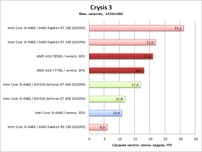 • И все же среди всех соперников только R7 250 взял планку в 30 FPS. Интегрированной графике это не под силу.