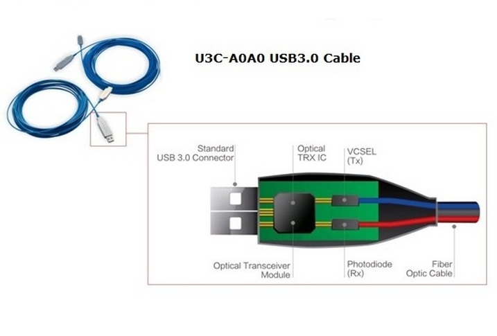 Теперь же усилиями инженеров компании EverPro и Cypress Semiconductor был создан USB-кабель длиной 100 м. Основным местом его использования могут стать офисные здания и вычислительные центры, серверные, отдельно установленные устройства для видеофиксации. Разработка получила сокращённое название AOC, однако она не имеет ничего общего с одноимённым производителем дисплеев. Полное наименование модели звучит как: активный оптический кабель (AOC) модели U3C A0A0-100 USB 3.0.