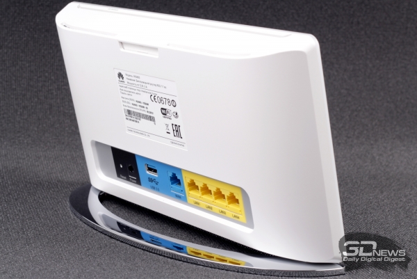 Антенны у Huawei WS880 встроенные. Сзади находится блок из пяти гигабитных Ethernet-портов, единственный разъём USB 3.0, гнездо питания и утопленная кнопочка сброса настроек. На задней стенке также имеется обязательная информационная наклейка. В ней же прячется ещё одна забавная деталь — пластиковая табличка, на которой указаны адрес и логин/пароль веб-интерфейса, имена точек доступа и ключ для них, а также приведён QR-код для скачивания фирменного мобильного приложения.