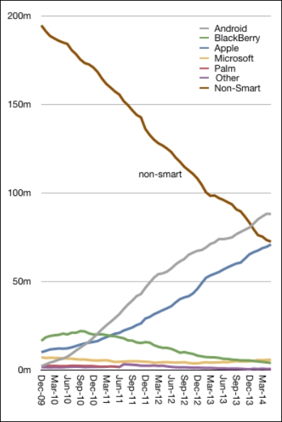 Отмечается, что «умные» сотовые аппараты есть у 169 млн американцев. Это соответствует 70 % рынка мобильных телефонов США. Соответственно обычными мобильными телефонами сейчас пользуются только 72,4 млн жителей США. Аналитики Asymco отметили, что теперь пользователей iPhone больше, чем обладателей аппаратов, не являющихся смартфонами.