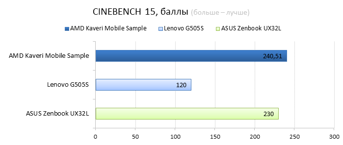 А вот в синтетическом многоядерном бенчмарке Cinebench наш главный подопытный умудрился немного обогнать своего «синего» конкурента и в два раза опередить APU предыдущего поколения. Весьма неплохой результат.