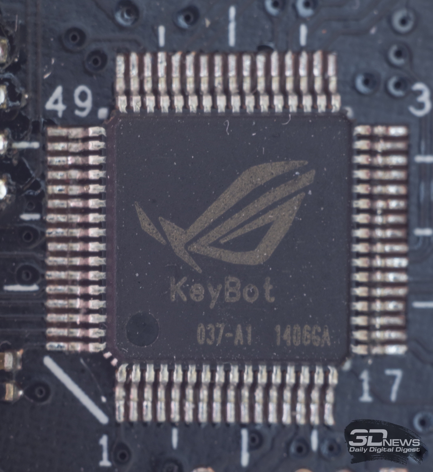 Наличие интерфейса ROG Extension не вызывает ни единого вопроса. Статус продукта обязывает, так сказать. В связи с этим наличие микросхемы ROG с маркировкой 035-A2 также закономерно. 036-A3, по всей видимости, используется для удаленного разгона посредством ROG Connect.