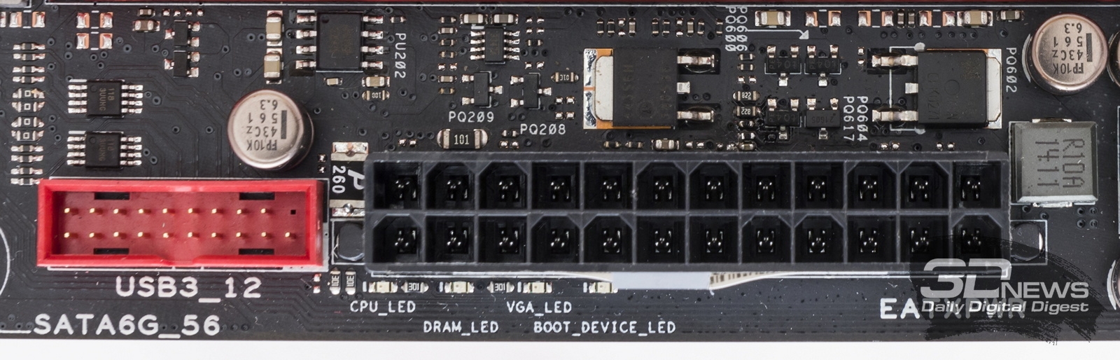 Q LEDs, помогающие навскидку оценить причину, по которой система не запускается, сгруппировались у основного разъема питания платы.