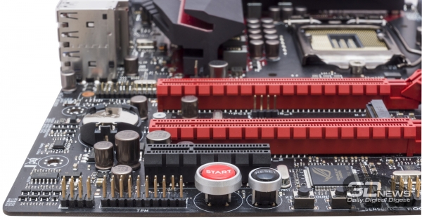 Слотов PCI Express в этот раз лишь три: пара PCI-e x16 и один PCI-e x4 — все потому, что M.2 и разъем для SupremeFX Impact II лишили инженеров возможности втиснуть хотя бы один дополнительный x1-слот. С другой стороны, на Maximus VI Gene, несколько иной по компоновке, такого слота тоже не было, так что оставим это на совести инженеров. Полноразмерные разъемы предлагают режимы x16/0 или x8/x8, что прекрасно подходит для реализации multi-GPU-конфигураций из максимум четырех графических процессоров (при наличии «двухголовых» карт). Огромное пространство между слотами тоже способствует созданию тандемов. Линии PCI-e, естественно, подведены напрямую от процессора, обеспечивая всю пропускную способность, свойственную третьему поколению интерфейса.