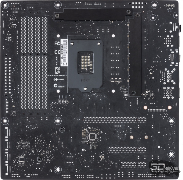 Обратная сторона платы загружена значительно меньше: здесь нашлось место для фирменного чипа ROG и пары металлических пластин, помогающих фиксировать массивный радиатор подсистемы питания.
