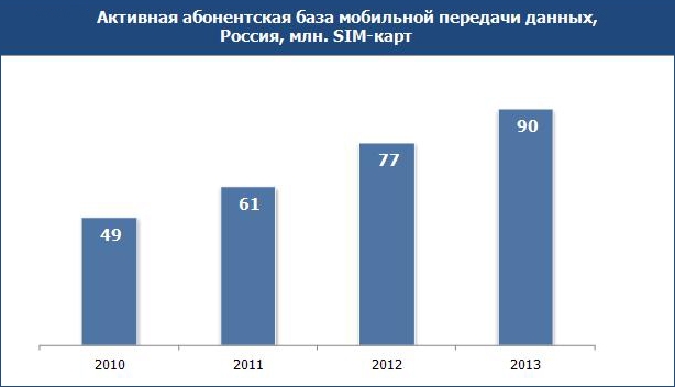 По оценкам, в конце 2013 года в России насчитывалось около 90 млн абонентов мобильной передачи данных. Количество пользователей мобильного Интернета выросло на 17 % по сравнению результатами 2012 года, а проникновение соответствующей услуги достигло 63 %.
