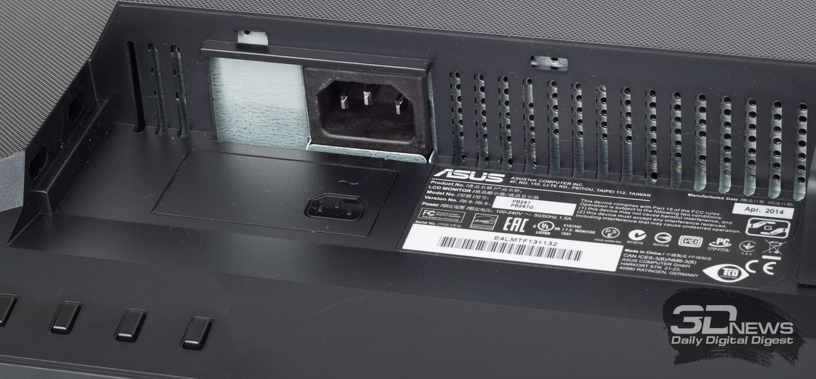 Раз уж мы начали говорить о задней панели, то посмотрим на неё внимательнее. На тыльной стороне ASUS PB287Q нет ничего примечательного, кроме клавиш управления. Ну а крепление VESA 100х100, как и видеоразъёмы, мы видели уже не раз.