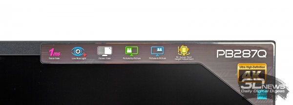 Если судить по характеристикам матрицы, ASUS PB287Q очень сильно напоминает другой доступный 4К-монитор, Samsung U28D590D, только «улучшенный и дополненный». Экраны у этих мониторов либо очень похожи, либо вовсе одинаковы. Последнее вполне вероятно, ведь ASUS не производит ЖК-панели, а покупает их на стороне. Вот только разных «фишек» у героя нашей статьи больше, чем у его аналога, что сразу даёт ворох плюсов в копилку ASUS.