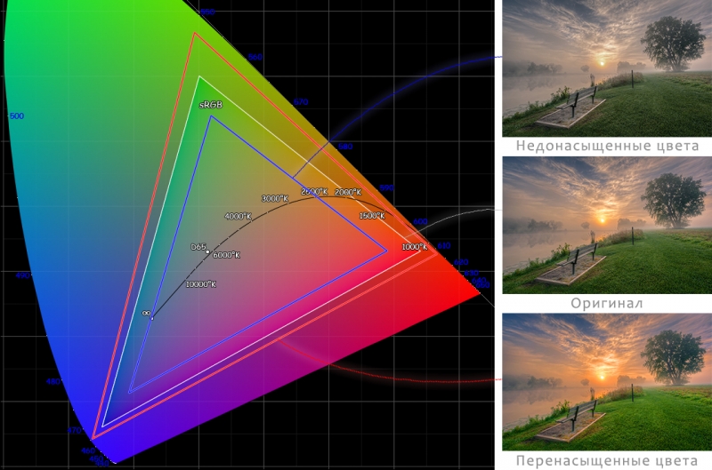 Из этого есть такое следствие: в идеальном случае цветовой охват дисплея должен совпадать с цветовым пространством sRGB. Тогда вы будете видеть изображения именно такими, какими их задумали их создатели. Если цветовой охват дисплея меньше, то цвета теряют насыщенность. Если больше — то становятся более насыщенными, чем нужно. «Мультяшная» картинка с перенасыщенными цветами, как правило, выглядит наряднее, но это не всегда уместно.