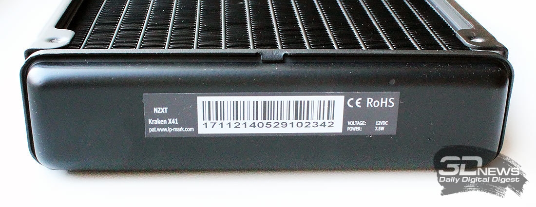 На одном из торцов радиатора имеется информационная наклейка со штрихкодом, указанием модели, напряжения (12 В) и мощности (7,5 Вт).