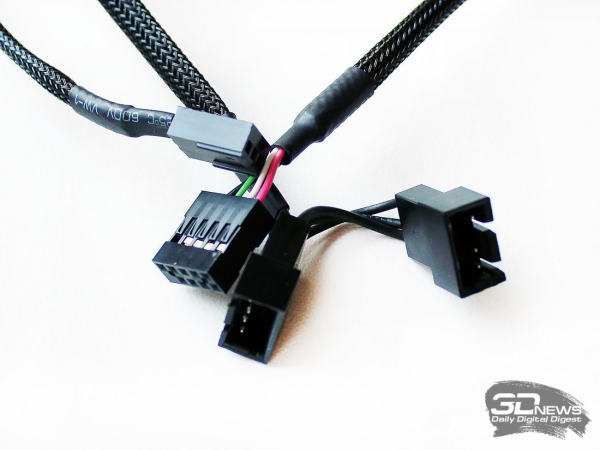 Сюда же можно подключить и второй вентилятор. Длина данного кабеля составляет 240 мм, а длина кабеля самого вентилятора равна 385 мм. Кроме того, помпа подключается к трёхконтактному разъёму питания и мониторинга вентилятора на материнской плате, а также 600-мм кабелем — к USB-разъёму на плате. Последний предназначен для программной поддержки системы, о которой мы вам расскажем чуть позже.