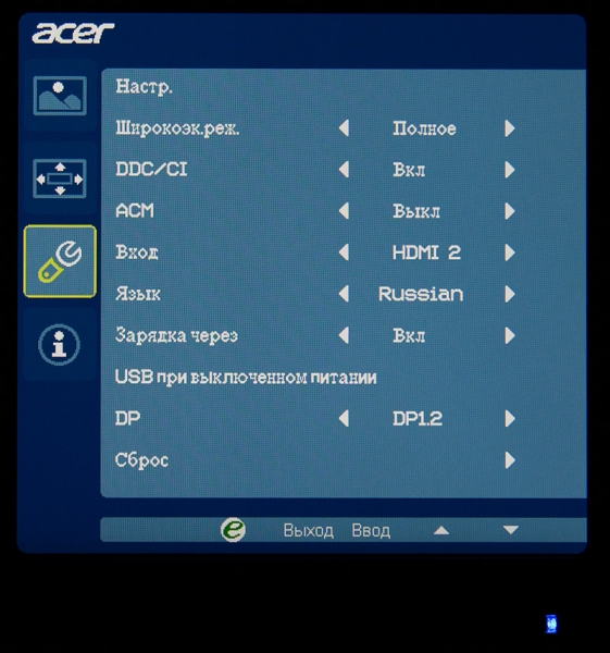 В полной версии меню настроек также не слишком много. Здесь можно отрегулировать яркость и контрастность, настроить цветовую температуру (по шаблонам «тёплый», «холодный» и так далее), отрегулировать насыщенность шести основных цветов, подкрутить гамму или включить режим sRGB.