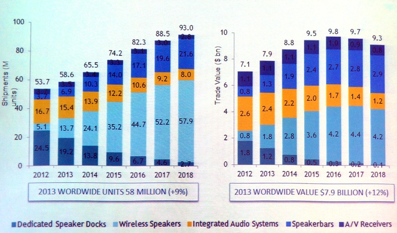 В 2013 году рынок домашнего аудио вырос на 12% в денежном отношении, достигнув $7,9 млрд. Всего на рынок было поставлено 58 млн устройств, что на 9% больше результатов 2012 года. Как видно на графике, главным драйвером роста стали беспроводные аудиосистемы: