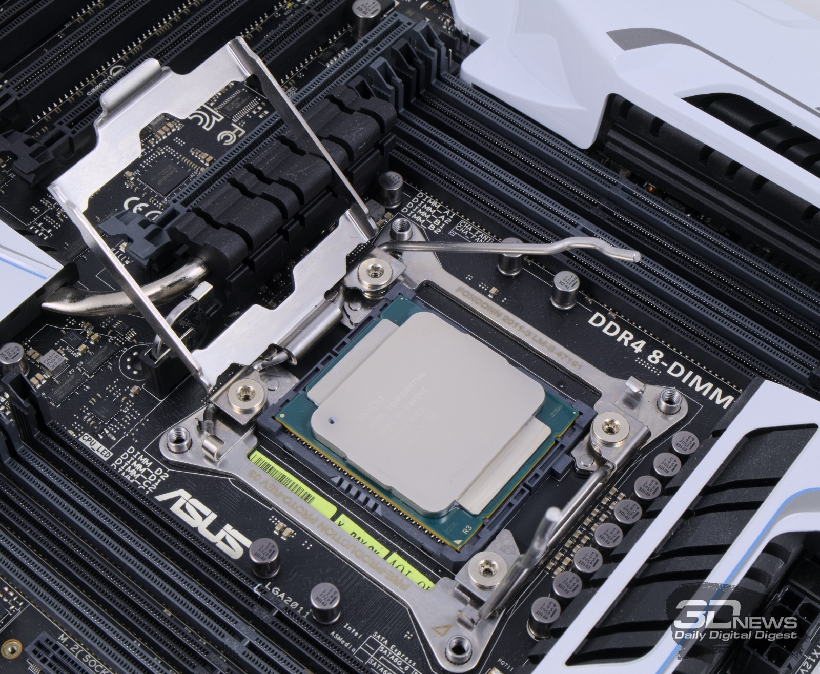 Следует отметить, что произошедшие с сокетом изменения не затронули механизм крепления процессорных систем охлаждения. Старые кулеры, которые можно было использовать в платформе LGA 2011, совместимы и с LGA 2011-v3. Единственное, что следует иметь в виду, это — некоторый рост расчётного тепловыделения. Все LGA 2011 процессоры, за исключением старичка Core i7-3970X, имели TDP на уровне 130 Вт, новые же Haswell-E наделены типичным тепловыделением на уровне 140 Вт.