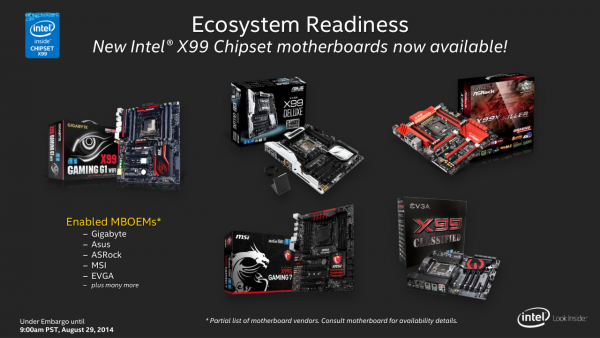 Кстати, говоря о X99, Intel обещает, что среди основанных на нём плат появятся и продукты, поддерживающие интерфейс Thunderbolt 2 с пропускной способностью до 20 Гбит/с. А это — в четыре раза более высокая скорость, чем обеспечивается шиной USB 3.0. Кроме того, Thunderbolt 2 предлагает широкий спектр разнообразных возможностей, включая формирование «цепочек» из устройств, подключение 4K-дисплеев по протоколу DisplayPort 1.2, соединение двух компьютеров и прочее.