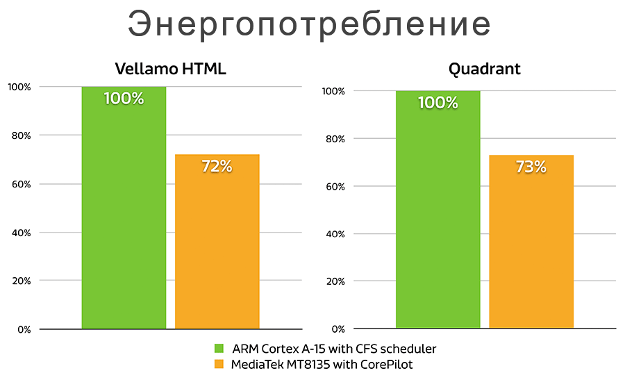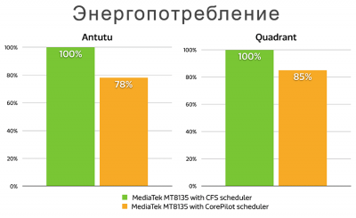 Попутно MediaTek разработала CorePilot — пакет технологий, направленных на улучшение баланса энергопотребления и производительности в гетерогенных процессорах. Составляющих CorePilot достаточно много. Во-первых, стоит упомянуть тот факт, что ради правильного распределения нагрузки между ядрами MediaTek пришлось заменить планировщик выполнения задач. Вместо стандартного для большинства ядер Linux в целом и Android в частности CFS (Completely Fair Scheduler) компания использует собственные: HMP Scheduler, правильно распределяющий задачи между неоднородными ядрами, и RT Scheduler, обслуживающий те задачи, которым требуется высокий приоритет для выполнения в режиме реального времени.
