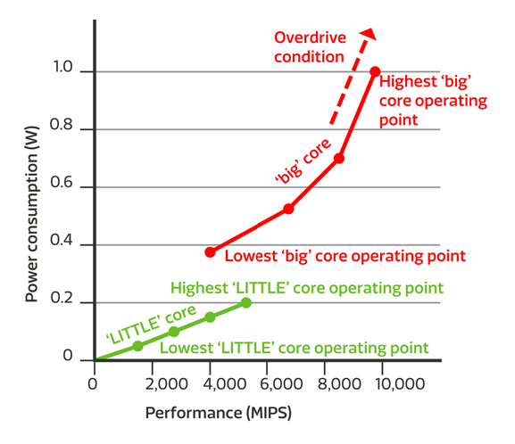 Общий принцип работы ARM big.LITTLE. Заодно обратите внимание на то, как круто задирается график энергопотребления в верхней части