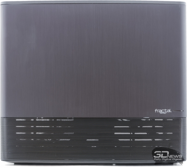 Так уж получилось, что спереди корпус целиком покрыт металлом. Две трети площади занимает алюминиевая декоративная накладка, на которой нашлось место только для упоминания производителя и окошка светодиода. Оставшуюся площадь шведы использовали для забора свежего воздуха, а чтобы она сильно не контрастировала с красивой текстурой металла основной панели, закрыли эту часть лица мелкоячеистой черной сеткой. Кроме того, фронт корпуса решили оставить без кнопок и разъемов, благодаря чему дизайн получился очень лаконичным и удачным.