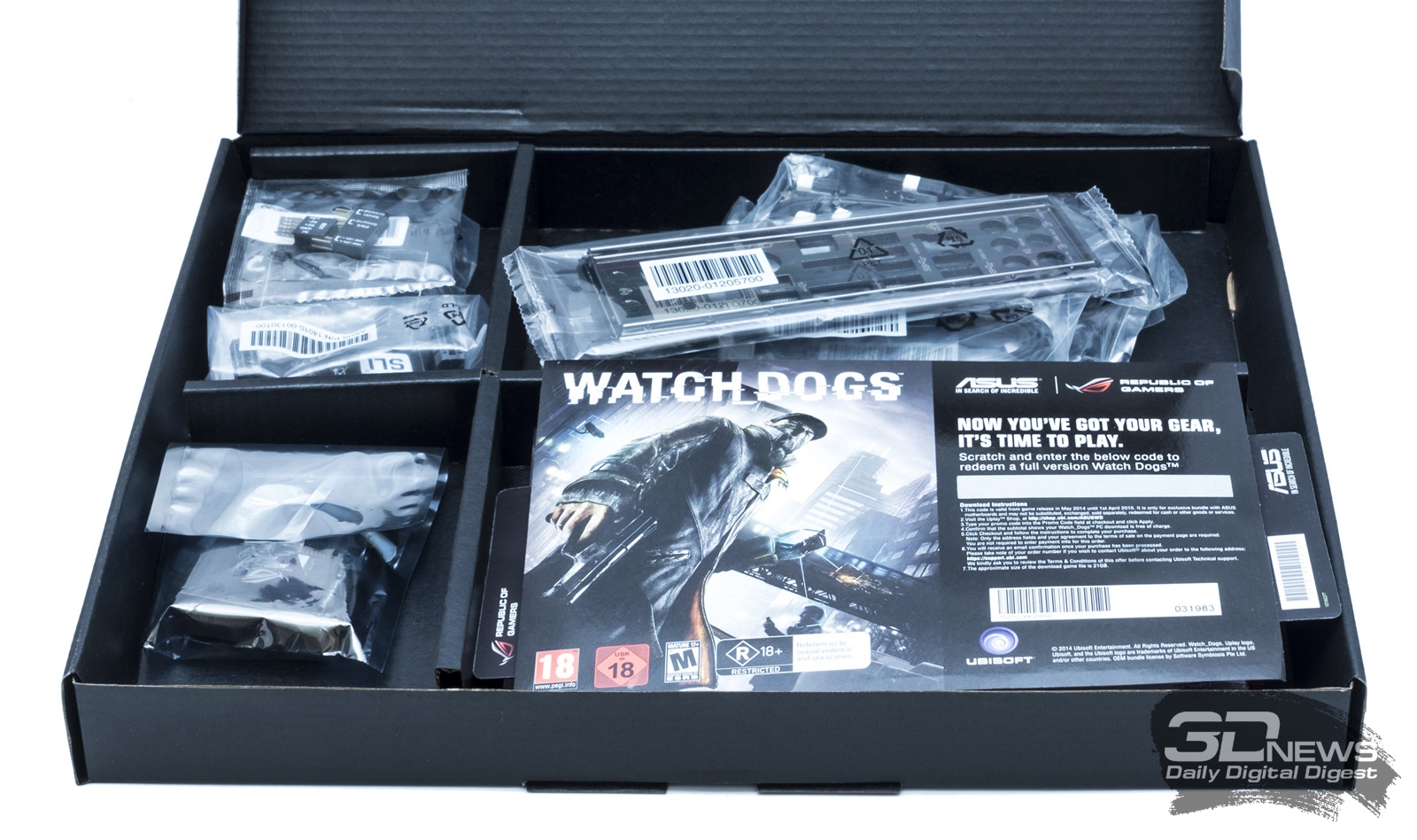 Инструкция, DVD-диск с драйверами и утилитами, а также набор для маркировки (почему-то лишь шести) накопителей и наклейка встречают нас в каждой плате серии ROG. Табличка на дверную ручку с просьбой «Не беспокоить» тоже наверняка знакома нашим читателям, равно как и колодки Q-Connector, улучшающие взаимопонимание корпуса и материнской платы. А вот дополнительный беспроводной модуль и интересная антенна попадаются не так часто. Более того, в комплекте с этой высокотехнологичной платой идет код на активацию полноценной версии не менее высокотехнологичной игры Watch Dogs! Представители игрового сообщества точно оценят. Дабы у вас не создалось впечатление, что мы можем лишь нахваливать продукты ASUS, привнесем ложечку дегтя — в комплект поставки снова не положили термопару. Неужели такой дефицитный продукт?
