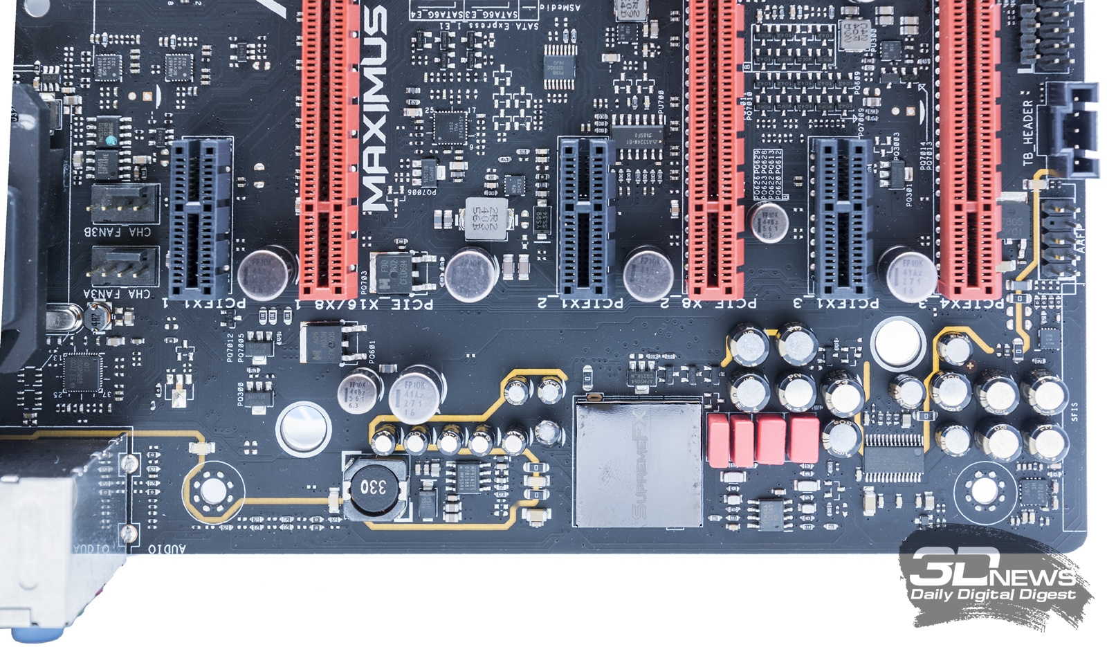 Кажется, мы где-то уже видели нечто подобное? Действительно, система питания полностью повторяет оную на плате Maximus VII Gene – немного другие дроссели в данном случае не в счет. Еще одно отличие заключается в том, что появился дополнительный четырехконтактный разъем дополнительного питания (уж простите за каламбур) — живительный ток сможет поставляться по большему количеству проводников.