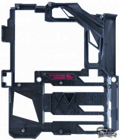 Задняя сторона ничего существенно нового не привносит, разве что из-за контраста крепежные отверстия «брони» начинают казаться еще более огромными. Помимо этого наметанный глаз заметит, что массивный радиатор VRM просто притянут винтами, то есть не использует усилительные пластины — их роль взял на себя основной backplate. Кроме того, между первой парой слотов PCIe x16 заметен чип с фирменной маркировкой ROG.