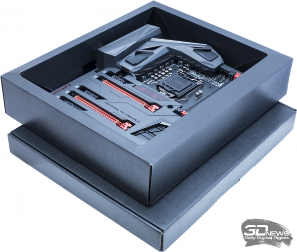 Прибывшая к нам материнская плата — не совсем рядовой продукт, поэтому и упакована она соответственно. Если бы не многочисленные шильдики поддерживаемых технологий и неброская надпись motherboard рядом с названием платы, можно было бы подумать, что внутри скрывается коллекционная версия видеоигры Watch Dogs.