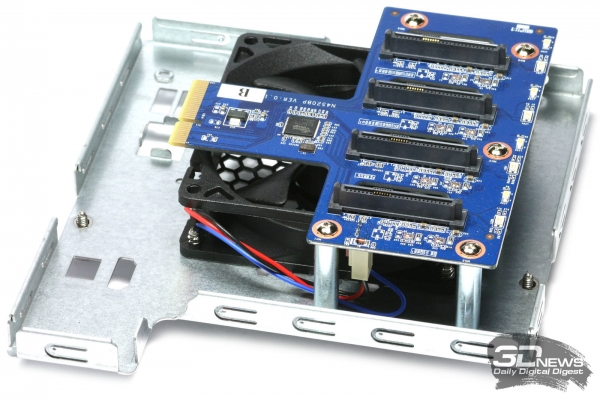 Контроллер SATA-интерфейсов для подключения внутренних дисков представлен на дополнительной плате микросхемой Sil3132CNU разработки компании Silicon Image.