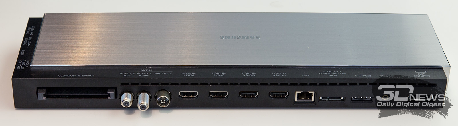 На задней панели Samsung One Connect расположен разъём CI+, предназначенный для подключения CAM-модулей смарт-карт, три антенных входа, квартет HDMI 1.4, Ethernet, а также два фирменных разъёмы Samsung, к которым подключаются переходники с компонентным и композитными разъёмами и со SCART.